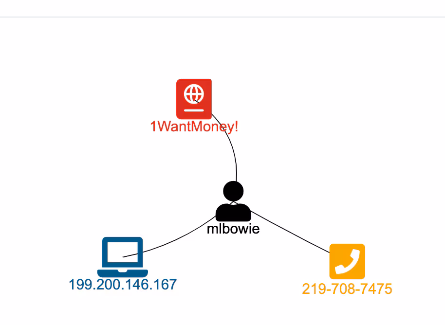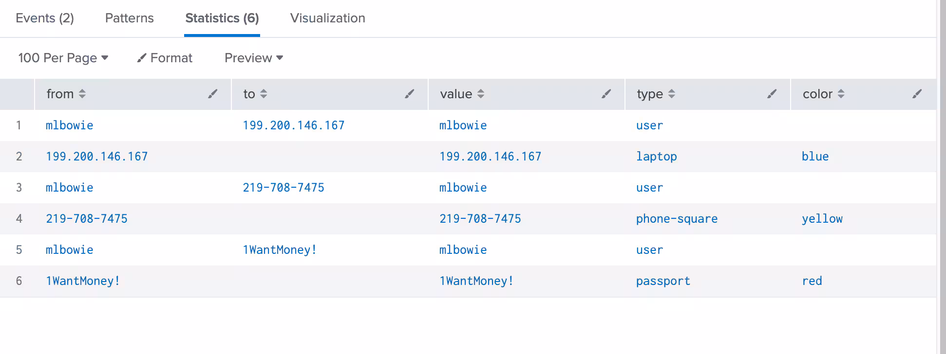 In a simple example showing a username and it’s related fields of ip_address, phone and password, we have to manipulate this to get the structure we want for the visualization.