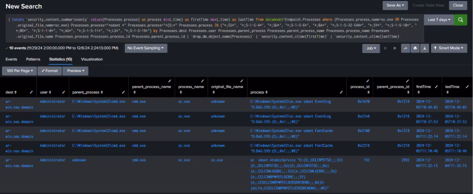 As new and evolving SDDL-based threats continue to emerge, the Splunk Threat Research Team will continue to develop new security content to help practitioners defend against these threats. For instance, we already monitor for suspicious service permission changes using “sc.exe sdset” as shown here:
