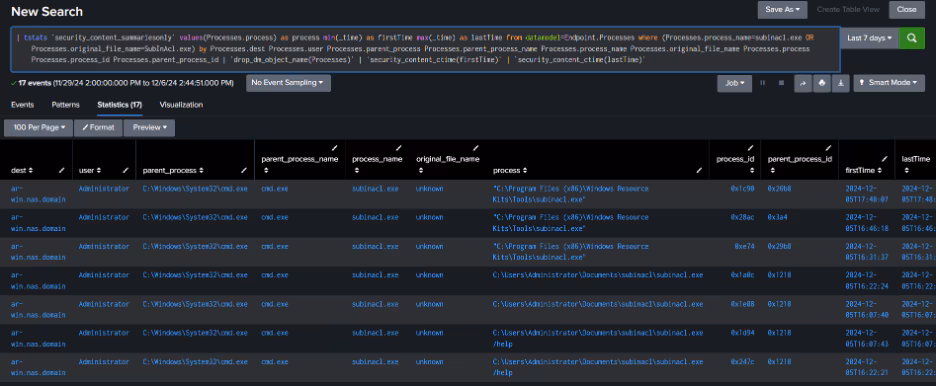 To combat the abuse of legacy tools like SubInAcl, the Splunk Threat Research Team developed a dedicated detection to identify their execution. This detection helps identify potentially malicious permission modifications across multiple Windows object types. It looks for any execution of the “SubInAcl” utility. As this is a legacy utility, it should not be present on any modern system, hence any execution is considered suspicious.