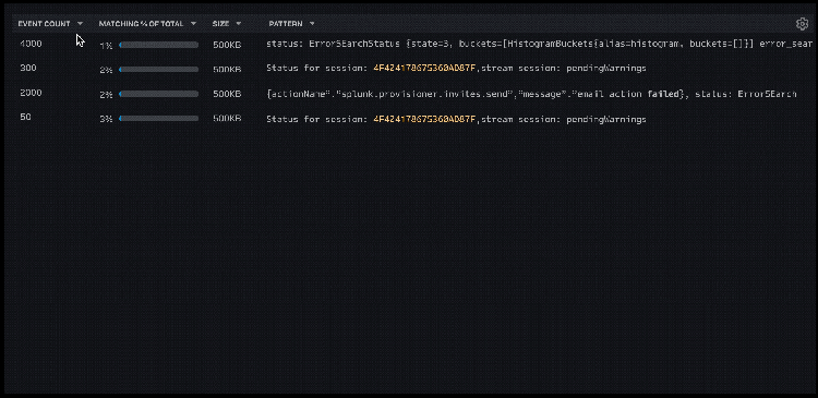 Fortunately, I was able to conduct a thorough analysis of many algorithms on several open-source datasets. Splunk has a wide customer base, where every customer has different formats for their logs. To simulate this, I chose a variety of open-source datasets for testing where each dataset has a unique log format. This led to a successful demo to a PM and their team. I am now working on further optimizing this research and testing more algorithms. The following mockup shows what I hope log clustering will look like in the future. To be clear, this may not be what the product looks like; it is just an example of how users might be able to see the patterns in their data captured from log clustering.