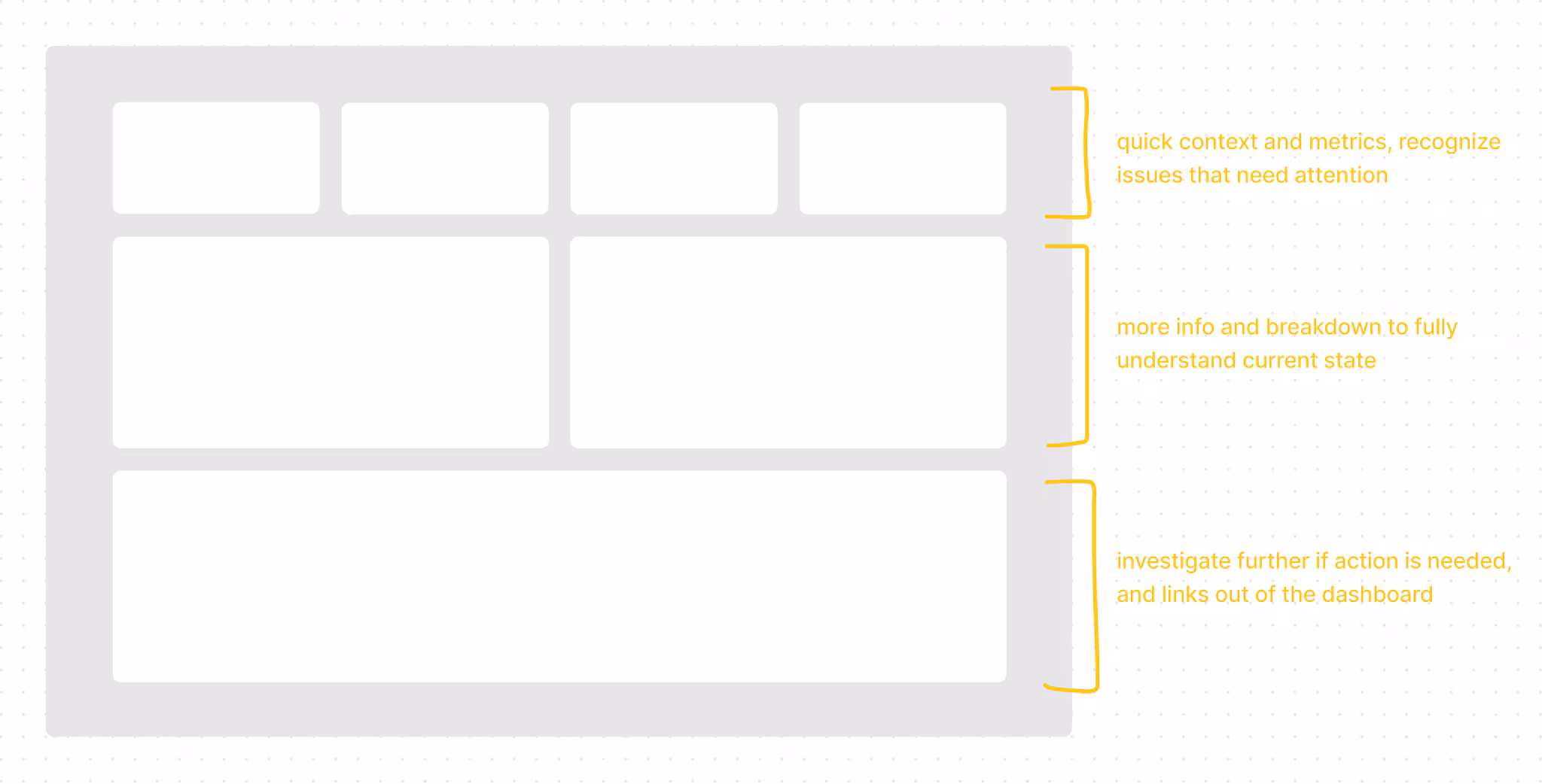 Notice the above monitoring examples made use of both grid and absolute layouts. While grid layout groups components naturally, absolute layout requires additional spacing, alignment and can have shapes in the background. Ensure these shapes for grouping are subtle in contrast and have enough whitespace in-between to avoid distracting from the information at-hand. Use grid layout for a simpler set up and absolute layout if you think icons and positioning will be especially helpful for identifying metrics.
