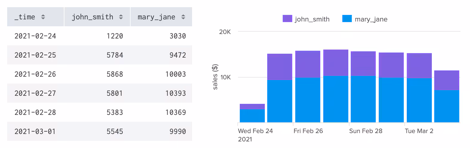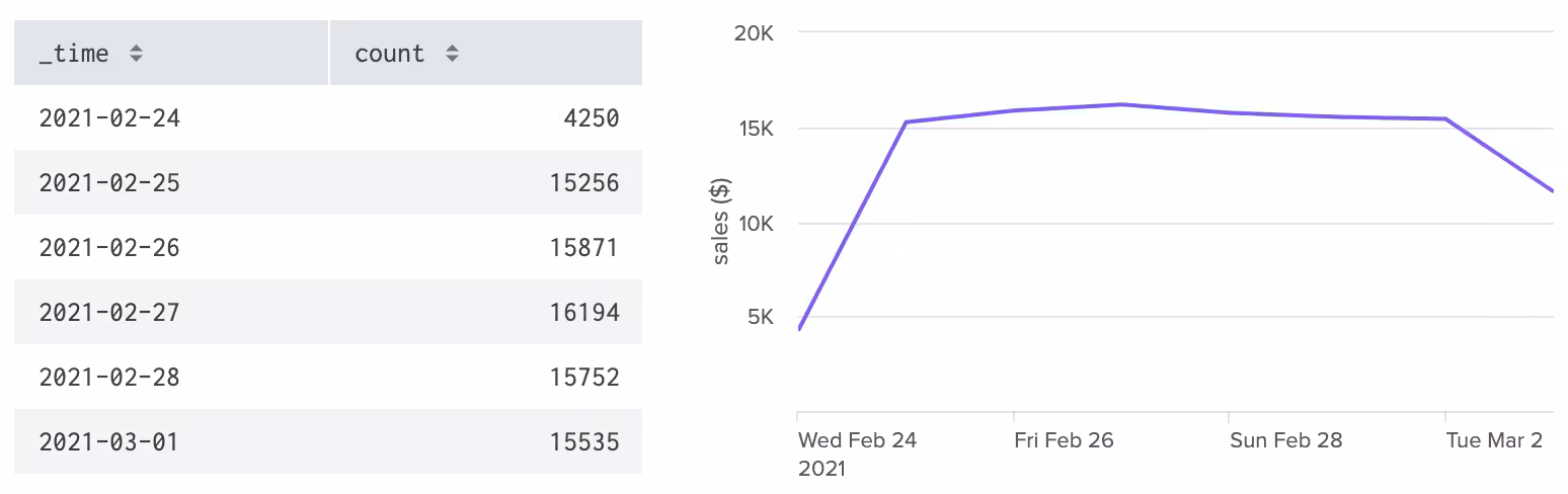 A basic time series chart can be displayed using the `timechart` command. For example, if you’d like to investigate which days of the week have the most sales: