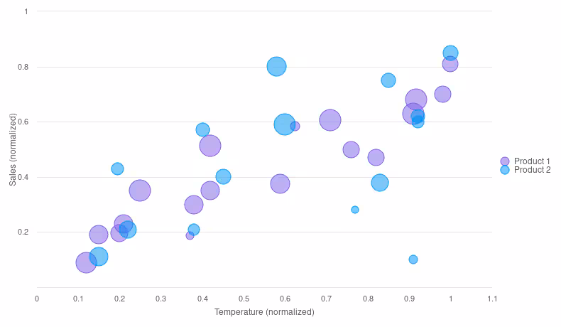 The most useful visualization for displaying the relationship between 2 quantitative variables is a scatter chart. For three quantitative variables, bubble charts or parallel coordinates are good choices. For example, you can investigate possible correlations between number of stores, sales made, and cost. In the following bubble chart, we can see “Temperature” and “Sales” are linearly correlated for “Product 1”, but they are not correlated for “Product 2”.
