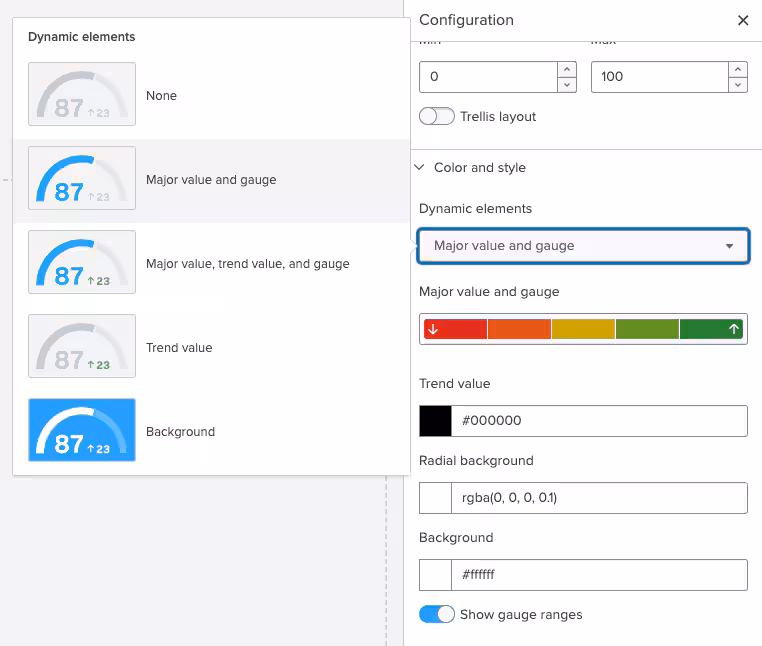 Add a Single Value Radial to your dashboard, then select a Dynamic elements option under Color and style. You'll notice the dynamic coloring options now include gauges.