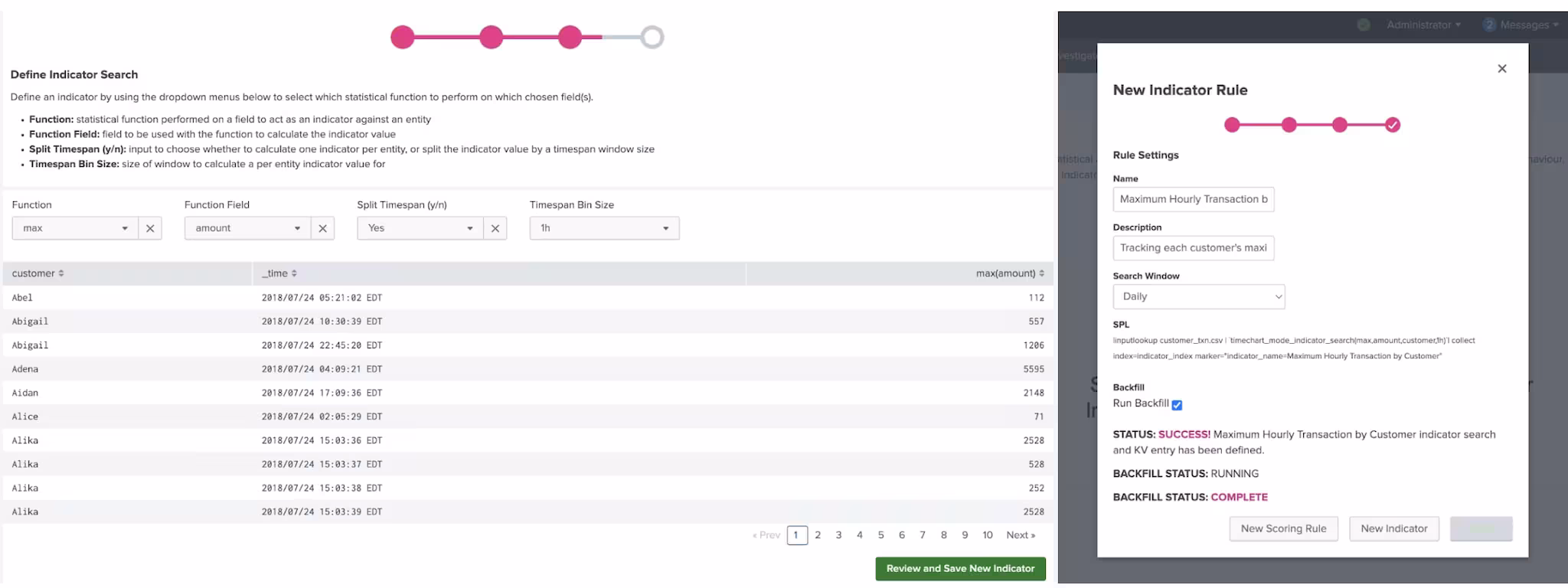 Deploying an indicator search is as simple as pointing the workflow towards a dataset, selecting the field which represents the unique entity, and leveraging the dropdown menus to select a function to build the indicator metric you’ll be tracking (alternatively more advanced users can leverage SPL searches entirely). Once satisfied you can save, schedule and immediately backfill the search through the pop-up menu.
