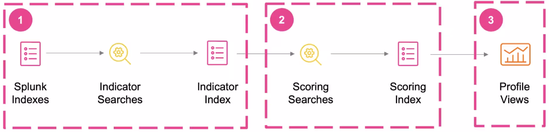 - First, indicator searches are deployed to track entity behaviors and output the metrics to the indicator index on a user-defined schedule.