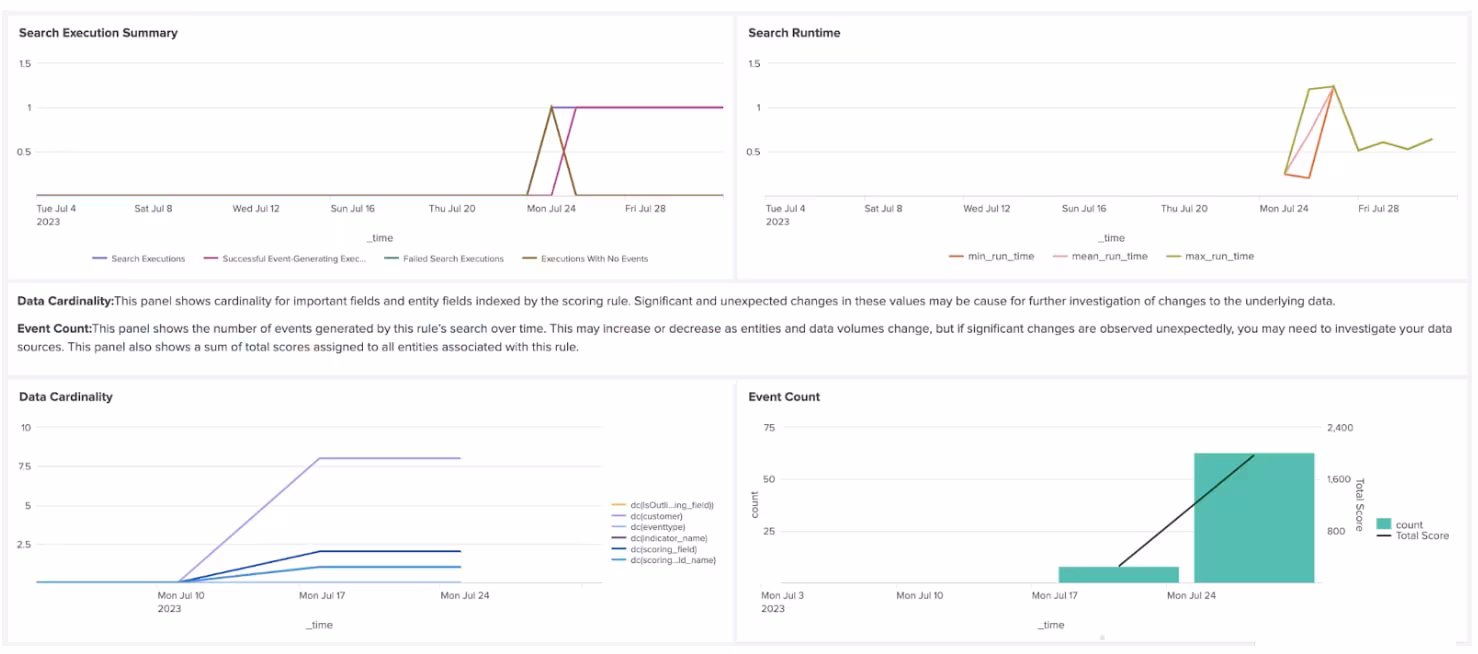The Entity Behavior Scores dashboard contains information on the volume and scoring attributions contributed by each rule triggered, to guide where rules should be tuned. Meanwhile the Review Indicators and Review Scoring Rules dashboards provide operational context into the number of events returned and search performance from your deployed searches over time.