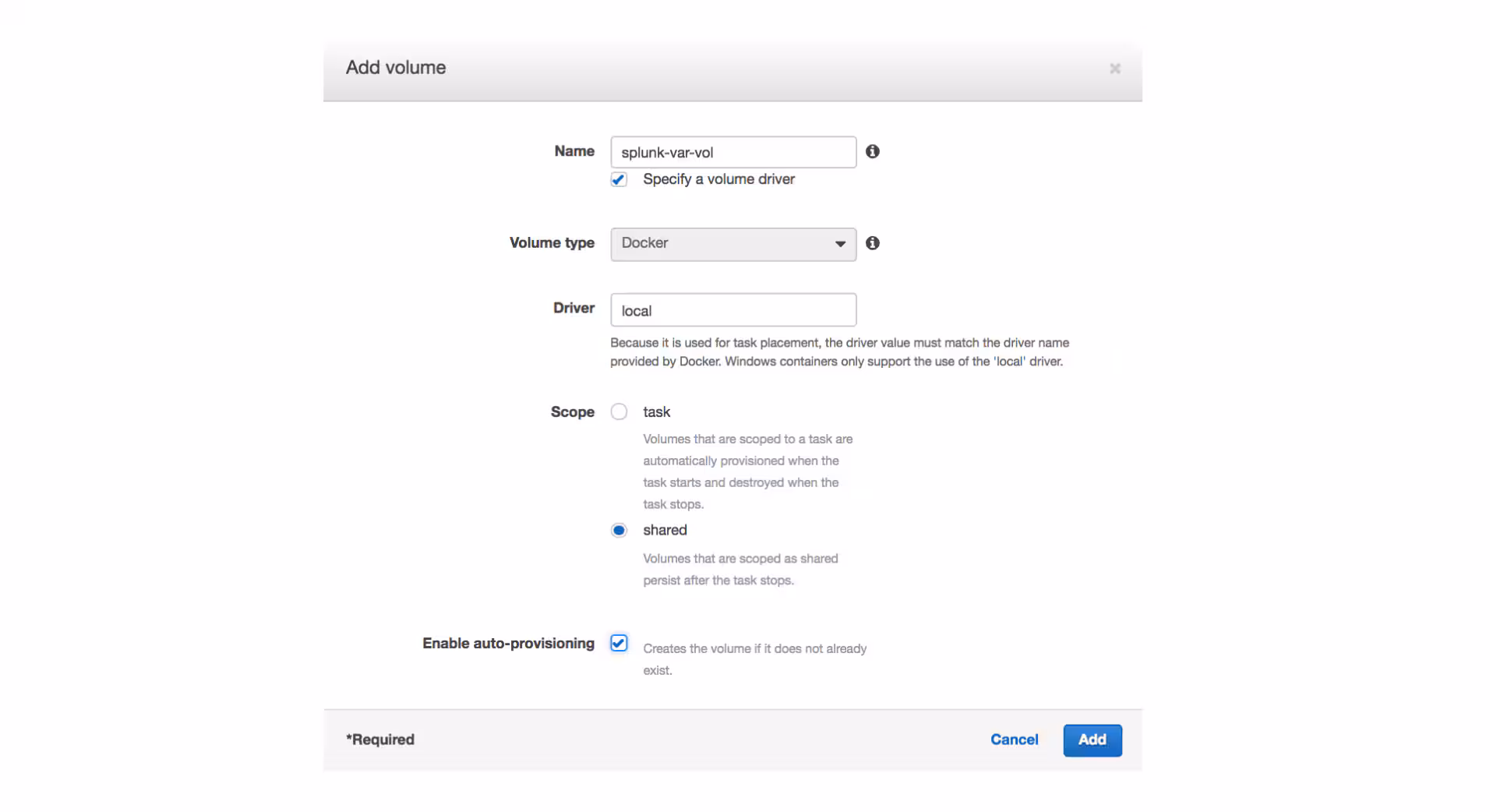 Create a volume for both of these (for example name them splunk-etc-vol and splunk-var-vol), and click on the “Specify a volume drive” checkbox so that you can change the Scope of the volume to “shared”, and Enable auto-provisioning.