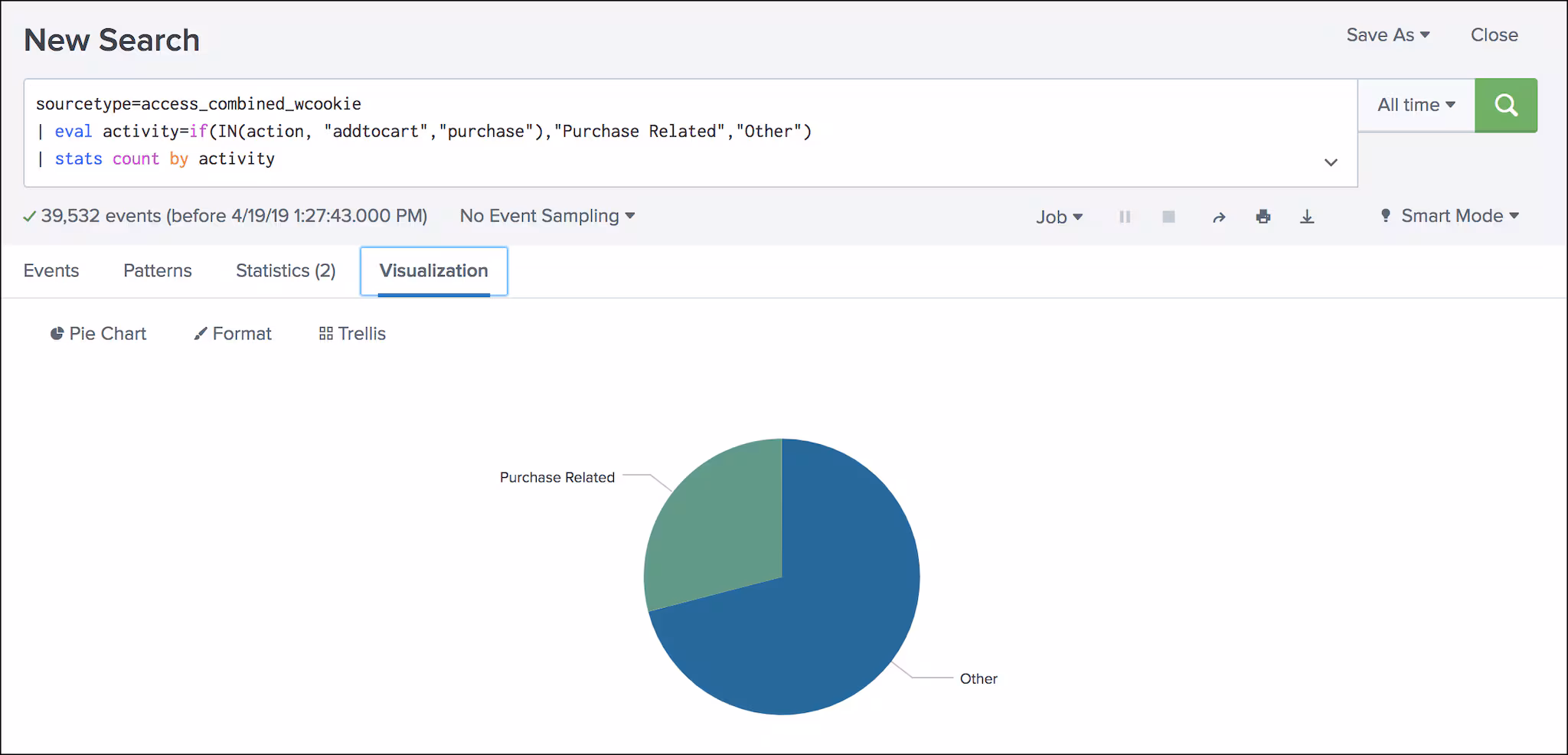 - The stats command counts the Purchase Related and Other values in the activity field.