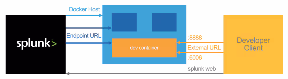 In the below image you can see our logical setup , where Splunk is interacting with the development image on our docker environment.