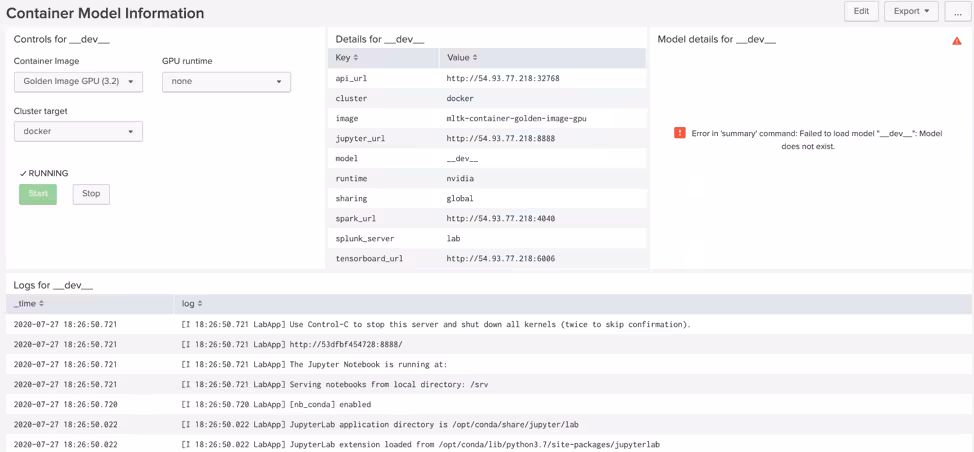 Once you have successfully connected Splunk to the remote docker instance go to Configuration -> Containers and start the golden image with the GPU runtime option set to nvidia (if you haven't done so already).