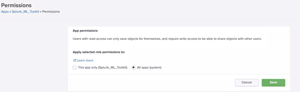 Note: The Splunk Machine Learning Toolkit (MLTK) app is a prerequisite for DLTK. MLTK permissions sharing must be set to all apps (system).