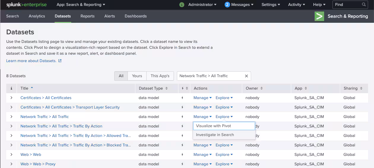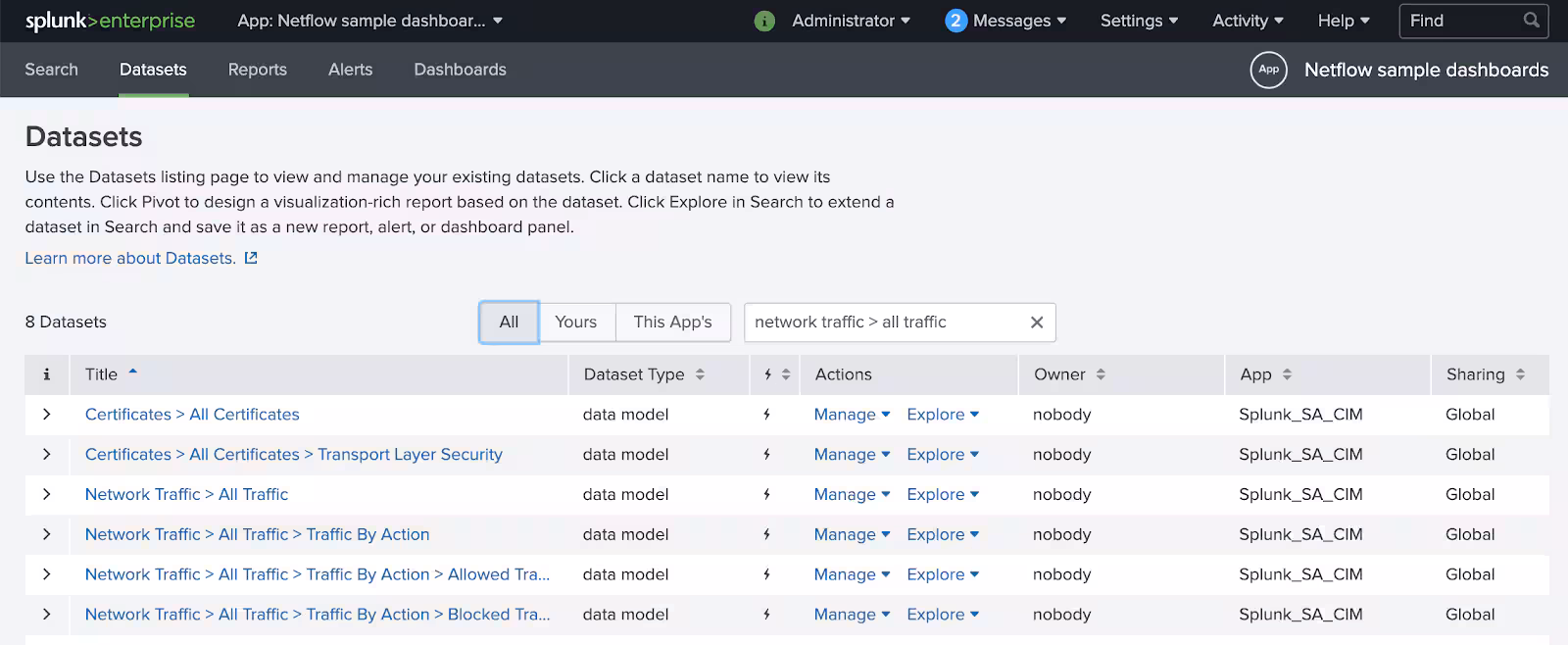 3) Now let’s review how the CIM can map NetFlow traffic fields contained at netflow_index to CIM: For that click on Datasets and filter by Network traffic: click on Network traffic > All Traffic:
