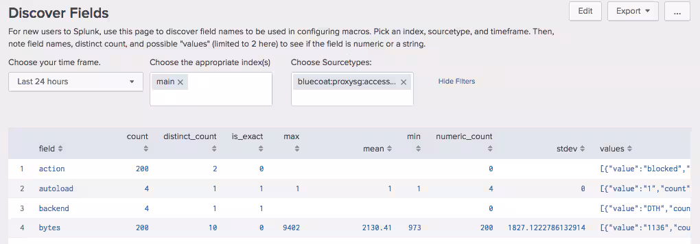 Field names will now appear. Take note on the names, type (numeric, string, or IP), and cardinality. The cardinality tells you how many unique values were found for that field name in the time range. A high cardinality (greater than 100) would not be good for a visual timechart command, but may be better suited for a stats command. Next, let's start changing the macros that drive the searches for the dashboards using the Configure Splunk Start App menu button.