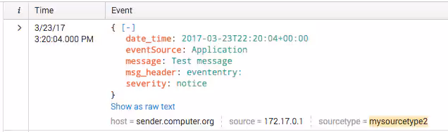 Here, the body contains the full JSON payload which is expected by the “event” endpoint. Note the “headers” is commented out in this case, as the metadata is now passed in the main body, and a UUID is not needed. This destination is particularly flexible, as individual portions of the full RFC 5424 message can be passed as fields in the “event” section. Note the host from where the message originated (host) can be, and often is, different from the directly-connected host from which the message was received (source). This is common when there are intermediate syslog-ng servers in the architecture. The Splunk output from sending the following syslog message: