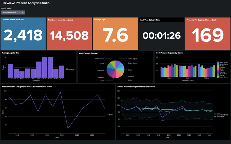 Here in the Santa Operations Centre, Tony the Elf and his team are able to monitor everything from delivery stats to favorite toys in the form of simple visualisations and metrics. Let’s take a deeper look at some of the insights seen from bringing these datasets together into a simple to understand dashboard: