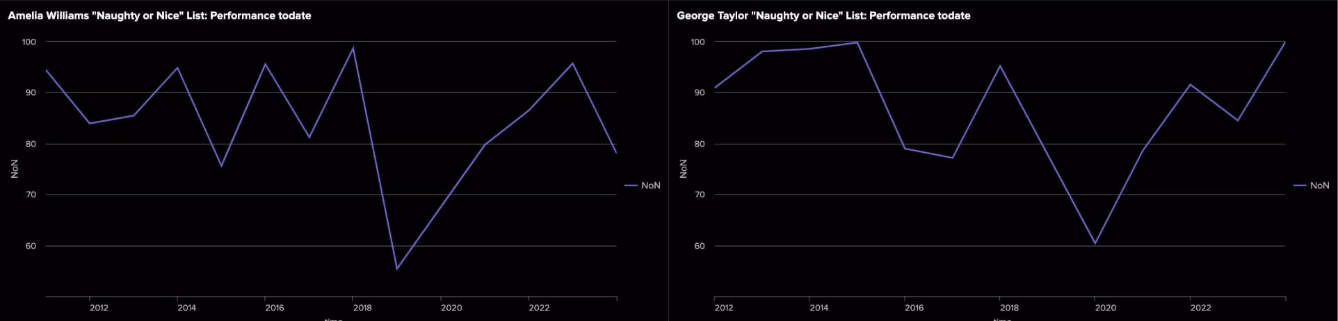 Finally, the dashboard takes a deep dive into the Naughty or Nice Lists, tracking each child’s progress over the years: