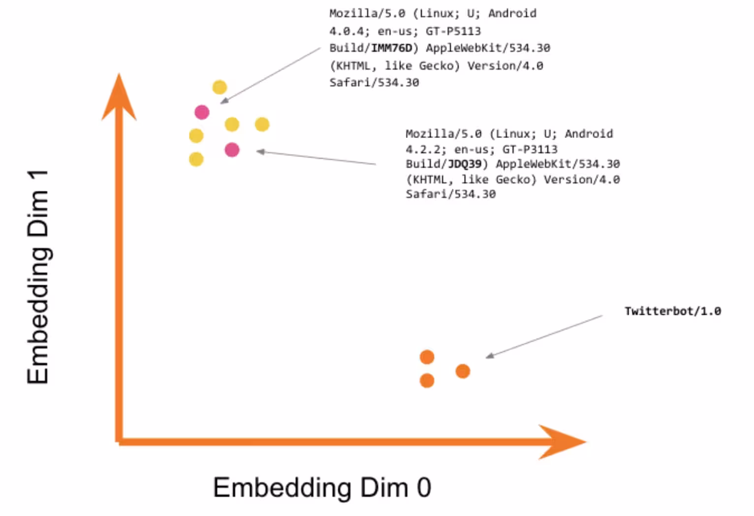 You can see this idea in the scatter diagram below. Similar user agents are in one corner and very different user agents are in another. Our vectors are the positions of these points and each point represents a single user agent’s encoded vector. In a real encoding example, we might have many more than 2 dimensions but this simple example demonstrates the key point: similar user agents have similar coordinates in our vector space so we can easily find agents that are similar.