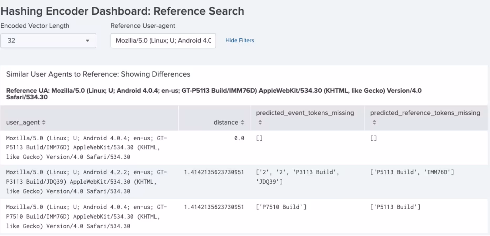This article demonstrates that encoding a complex data structure such as a user agent in a way that allows more sophisticated analysis is possible with Splunk and DSDL. We’ve created some useful workflows for a threat hunter conducting Model-Assisted Threat Hunting using the DSDL app and Splunk dashboards that make the process of finding related activity much simpler and more efficient. This needn't stop at user agents though, if you think about your day-to-day work how often do you find a field or an event where you want to ask: “Show me all the things that are like this, but not exactly the same”. In my experience, this sort of question can come up for any number of different types of data: usernames, TLS signatures, process names, URLs and URIs to name just a few. Implementing this kind of logic could drastically improve the flexibility with which you are able to dive in and explore to answer such questions.