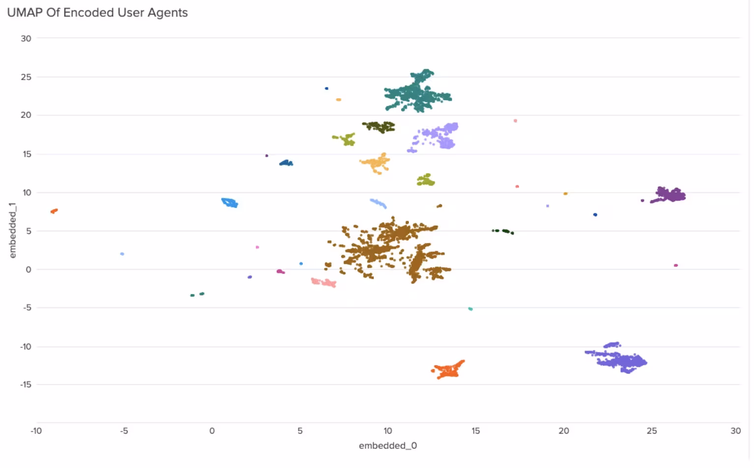 It’s possible to take this idea even further using a technique like UMAP. UMAP allows us to take a set of numerical input vectors with high numbers of dimensions, exactly like our encoded user agents, and project it down into a 2-dimensional image to explore, much like our simplified example above, but on a much larger scale. Below you can see such an example where we’ve used clustering to identify groups of similar user agents. This could be a valuable tool in the face of changing behaviors to drill down and find related activities.