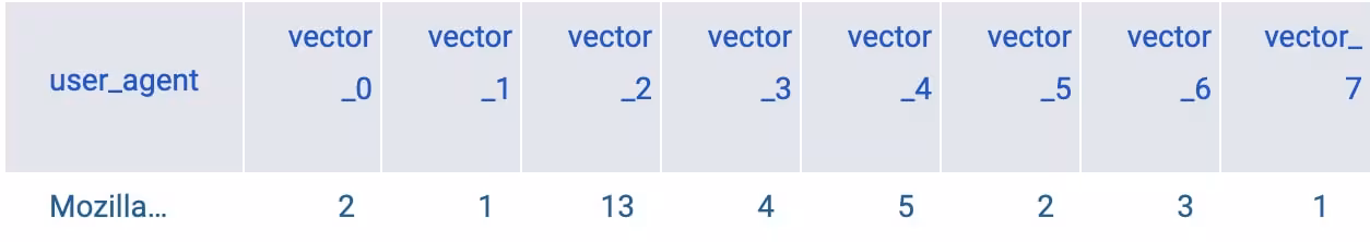 This SPL takes the input field “user_agent” and converts it to an 8-dimensional vector in the fields “vector_0” to “vector_7”.