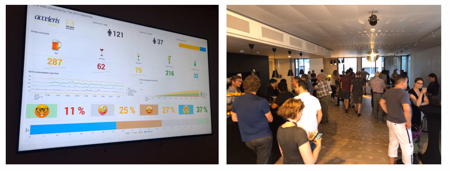 We knew that data would be generated during the party, so of course, we wanted to visualize this in the rooms and on the rooftop of our beautiful new office. With the help of Splunk, we produced a visualization of the mood of our guests, how many beers, wine and cocktails they consumed, and how this consumption “developed” over time.