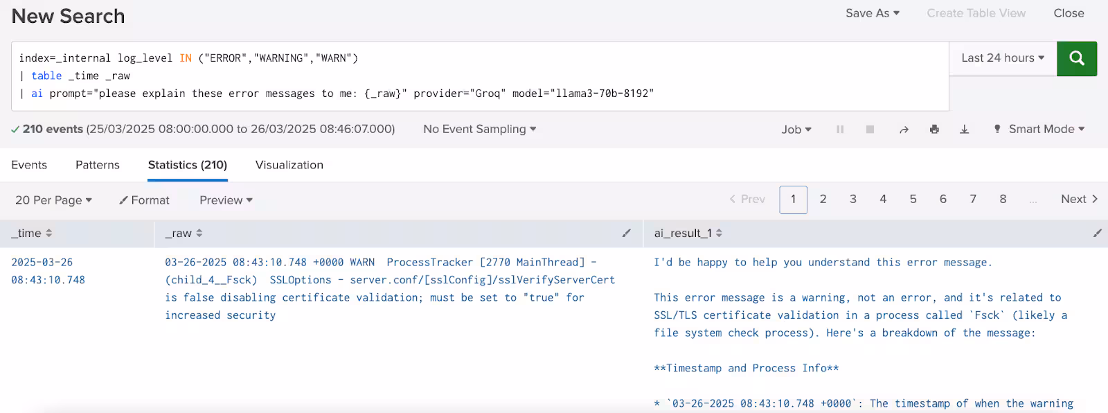 Once you have established a connection with an LLM provider, you can then use that provider within a Splunk search using the ai command. The ability to embed Splunk data into prompts to external LLMs gives you a lot of flexibility when it comes to enriching your Splunk data with insights from an LLM.