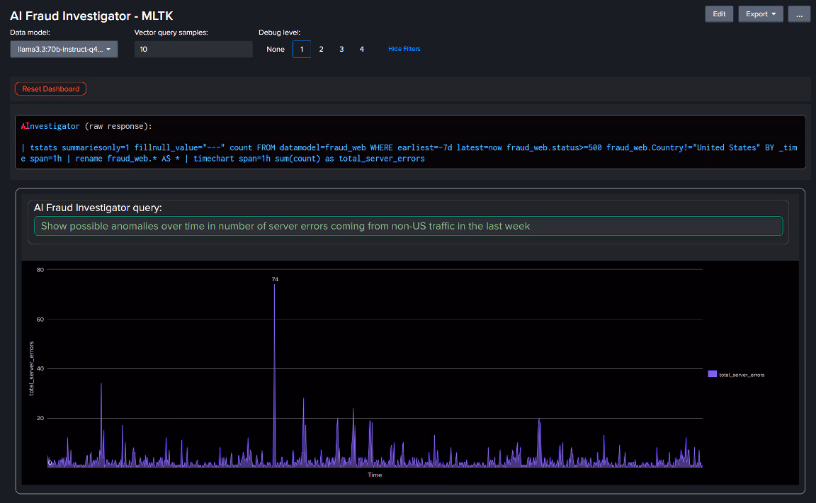 In the following example, a user asked to display anomalies in server errors over time, specifically filtering for non-US traffic. The AI agent generated the appropriate SPL query, selected a suitable Timechart visualization, validated the query, and automatically executed it, presenting results seamlessly.