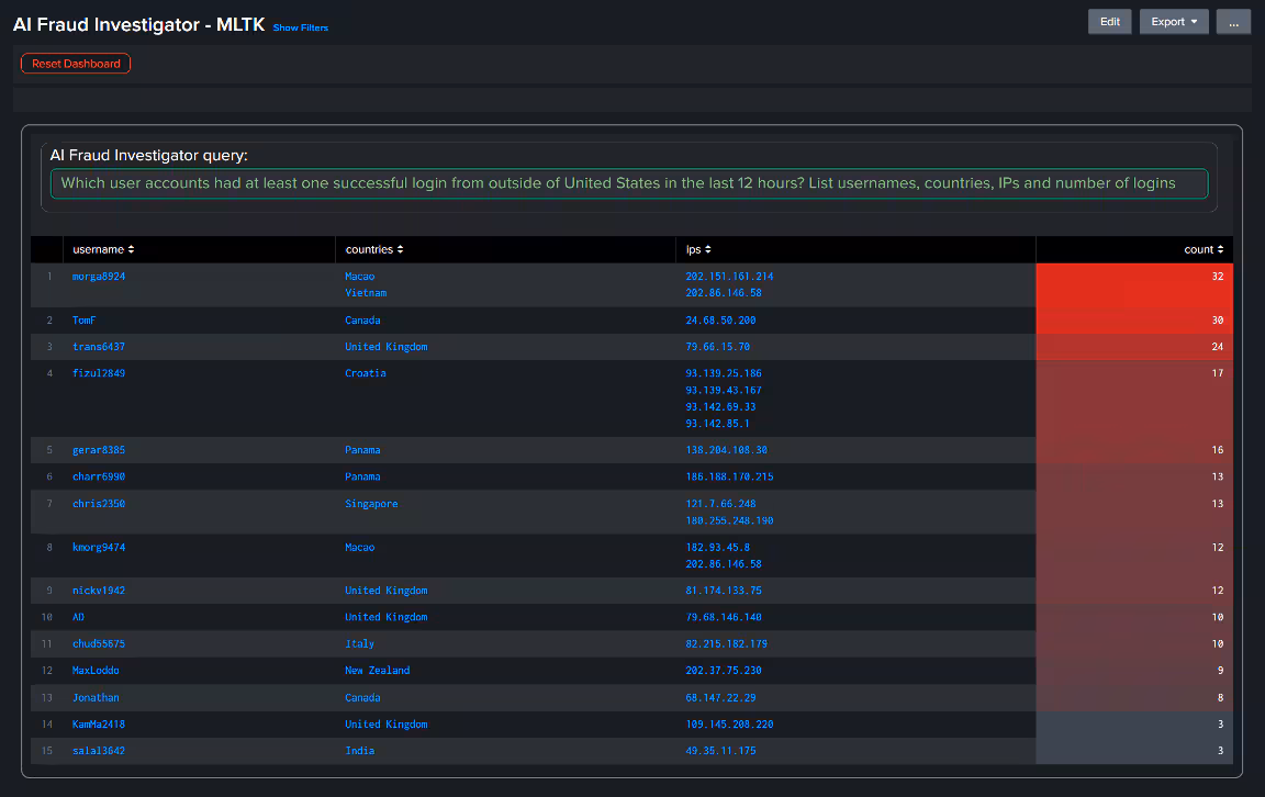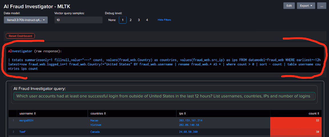 The key point is to leverage LLM's uncanny ability to learn from well-structured examples. With the latest MLTK installed and configured, you can test this capability directly using the Splunk search prompt. Consider this query to list accounts with multiple logins from different countries: