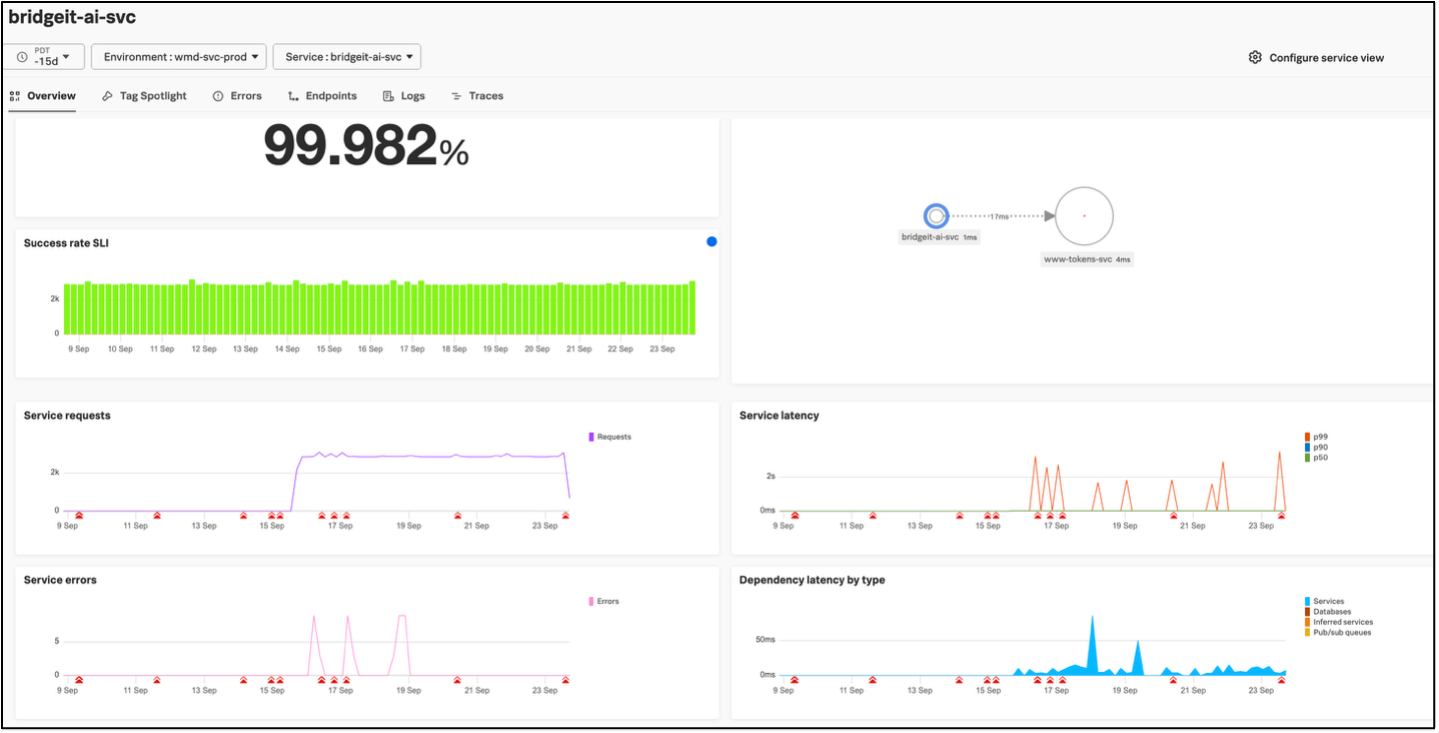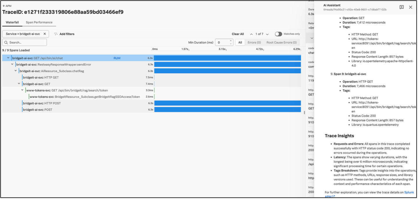 This APM dashboard from Splunk Observability Cloud is monitoring the bridget-ai-svc service, which is the main AI orchestration the .conf RAG pipeline.