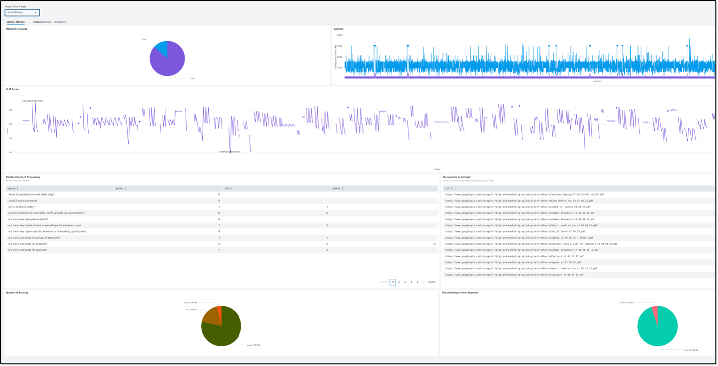 Monitoring LLM (Large Language Model) and RAG (Retrieval-Augmented Generation) systems requires visibility into not just performance (like latency), but also the quality and trustworthiness of responses. The Splunk dashboard below provides a single-pane-of-glass view that brings together key signals from across the stack—LLM output, source documents, latency, and reliability scores.