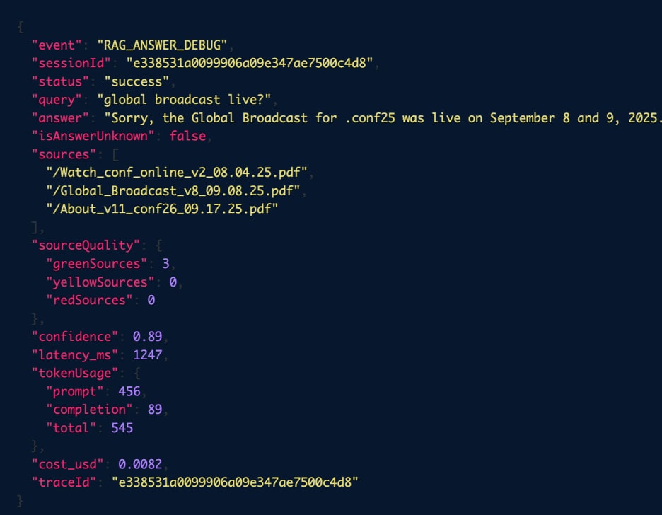 The following is a sample application log captured for a successful RAG answer, including prompt and answer context, retrieval sources, and tracing metadata. This level of structure enables precise dashboards, alerting, and root-cause analysis in Splunk.