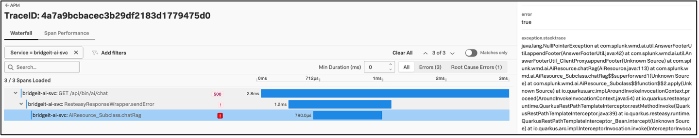 These APM trace screenshots from Splunk Observability Cloud represent a “needle in a haystack” detection scenario—an essential aspect of observability when troubleshooting RAG systems.