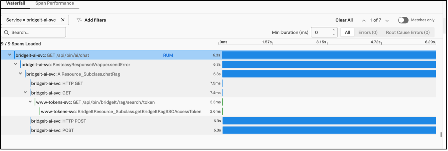 Span Breakdown | Visualizes each stage of the RAG lifecycle (token, POST, etc.). |