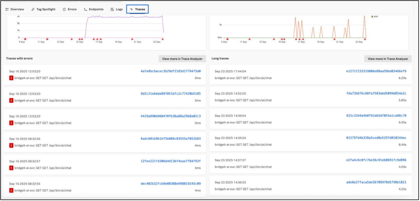 Slow Traces | Identifies bottlenecks in vector search, embedding, or inference. |