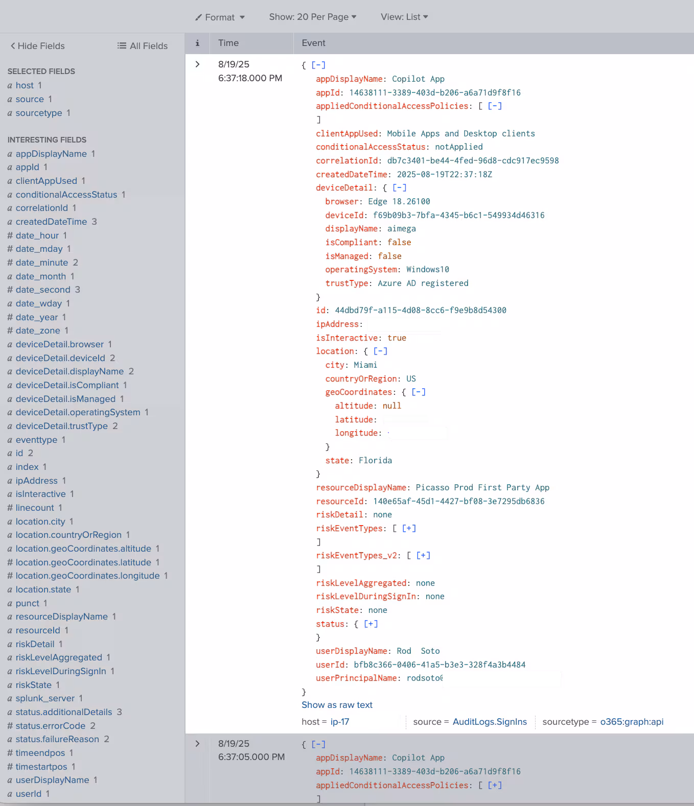 We can now do some basic analytics with this metadata. In the following search we can see a distribution of origin of access, conditional status and reasons for the conditional status. conditionalAccessStatus is notApplied is a strong indicator that there may be a gap in the organization's security policies. An administrator should investigate why policies are not being triggered, especially for access from non-compliant and unmanaged devices. Are there users interacting with Copilot with non-managed or compliant Devices? Are there discrepancies in the origins of users and devices interacting with Copilot? Notice that some additional details are very verbose.