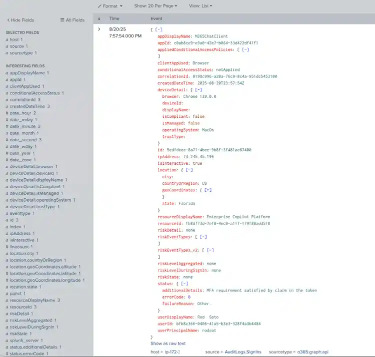 Using Splunk with Microsoft Copilot can be very powerful to monitor AI interactions and possible attacks. These exports are quite verbose and extensive, using Splunk is the way to manage the extensiveness and detail of these exports to make sense of the interactions between users and Microsoft Copilot.