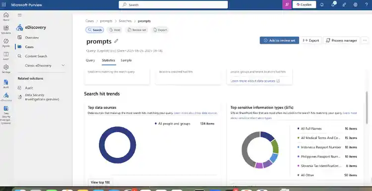 Then we are going to look at prompt logs collected from Purview eDiscovery. Microsoft Purview eDiscovery is a tool that helps organizations identify, preserve, collect, review, analyze, and export electronic data across Microsoft 365 to support legal and compliance investigations.