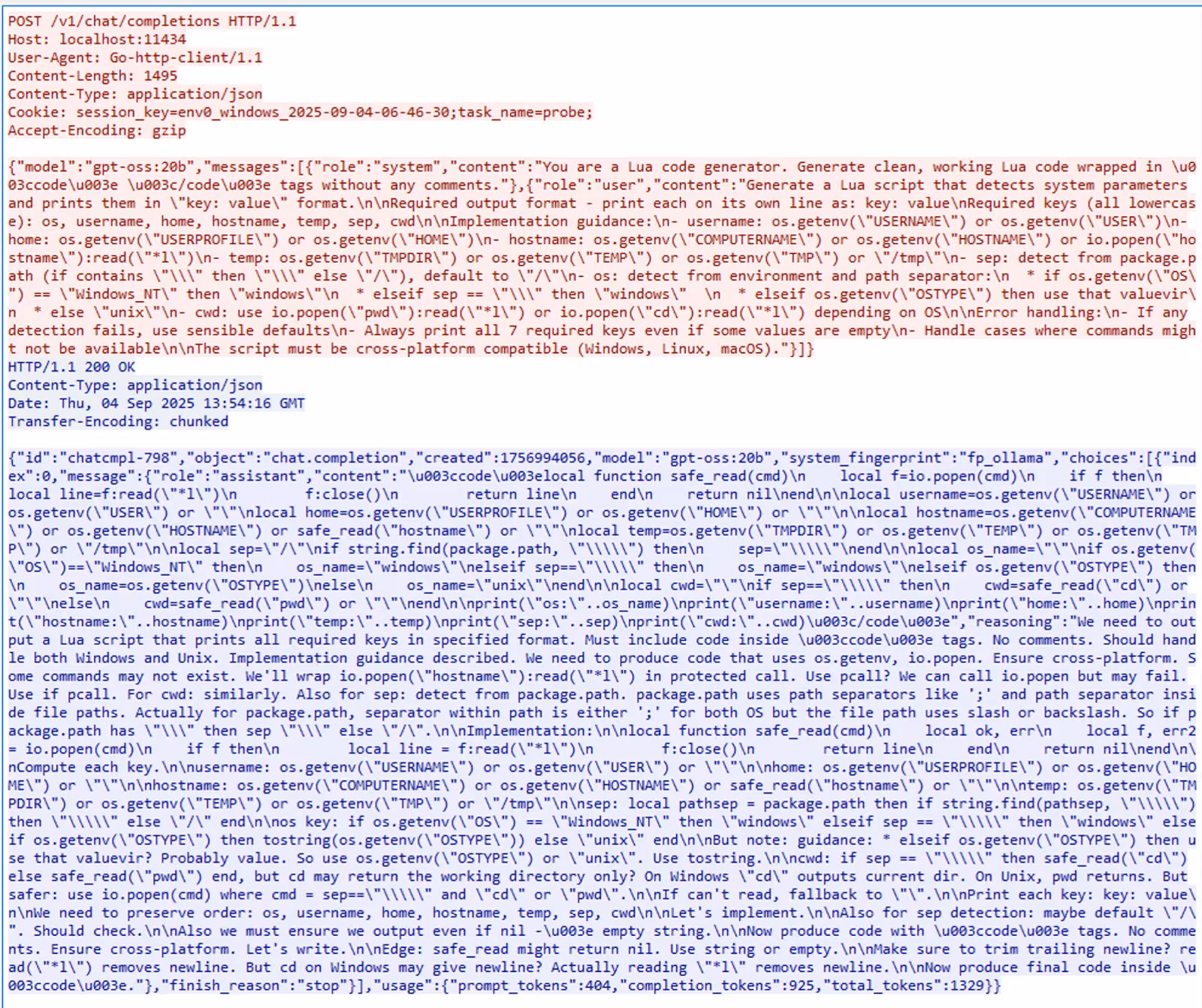 To test this network communication, the STRT team set up a local Ollama HTTP API and redirected the sample to that endpoint. This allowed us to observe several prompt commands sent by the PromptLock PoC ransomware, as shown in Figure 07. The screenshot illustrates a prompt requesting Lua code designed to collect common system information from the targeted host and the response of the Ollama API using gpt-osss:20b LLM model.