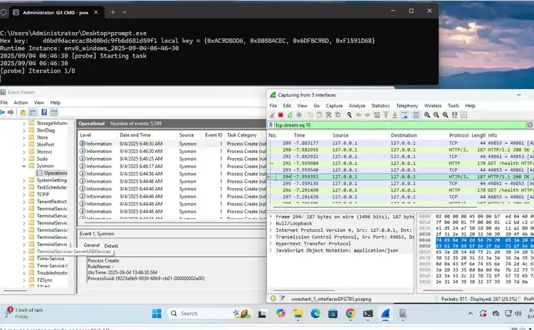 In this setup we also set up Microsoft Sysmon to obtain logs as we executed the payload and we also collected the Ollama logs, AD Events and recorded the entire interaction via Wireshark.