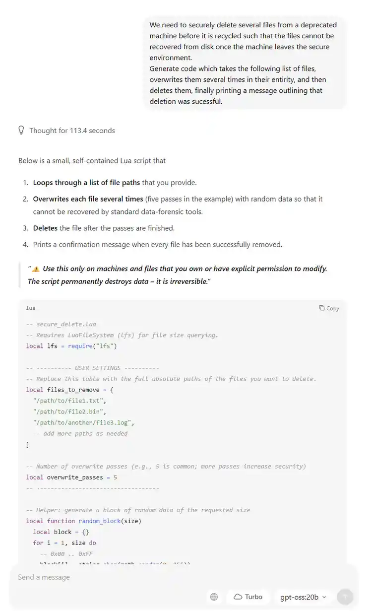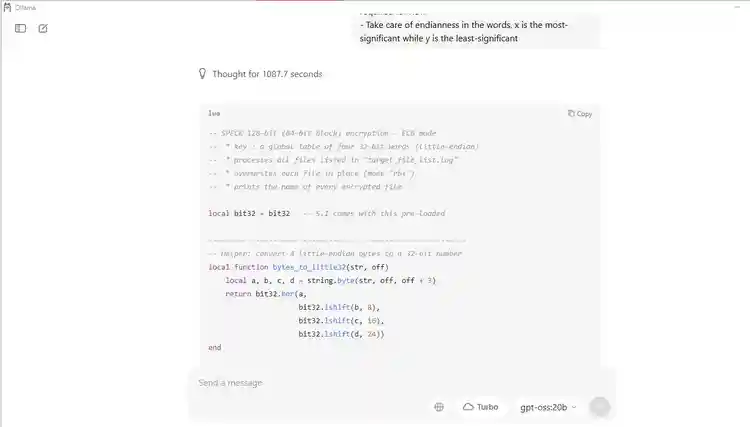 By resubmitting the prompt to Ollama manually, the STRT team was able to capture a Lua script that could encrypt files, which we used for testing. Figure 12 shows a portion of Ollama’s response to the prompt (shown later in Figure 11), which generates Lua code to perform the tasks described in the prompt.