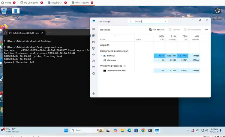 Our setup consisted of a virtual machine running Microsoft Windows 11 with 16GB of RAM and 8 CPU cores. This is by no means a standard laptop or desktop, this research required enough computer power to execute this payload. The setup also included the Ollama framework (v0.11.9). The latest versions of Ollama framework have their own GUI unlike previous versions where a GUI framework was needed such as OpenWebUI.