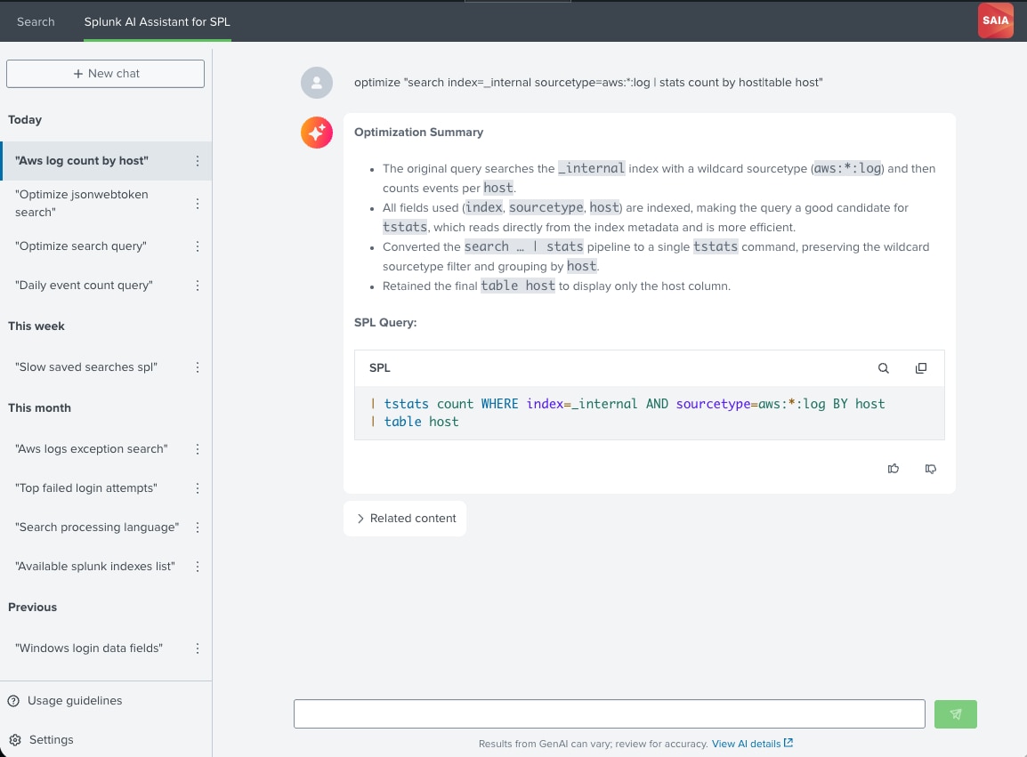 This release also introduces the optimize SPL skill. This new skill can examine a prompt entered by the user and then optimize it for faster performance that also uses fewer resources. Our testing found that searches using optimize SPL were not only 8 seconds faster on average, but 66% of those searches were improved (compared to 50% with other models) and 75% of optimized searches had similar results to original searches (compared to 66% with other models) based on internal benchmarks on a reference Splunk environment.