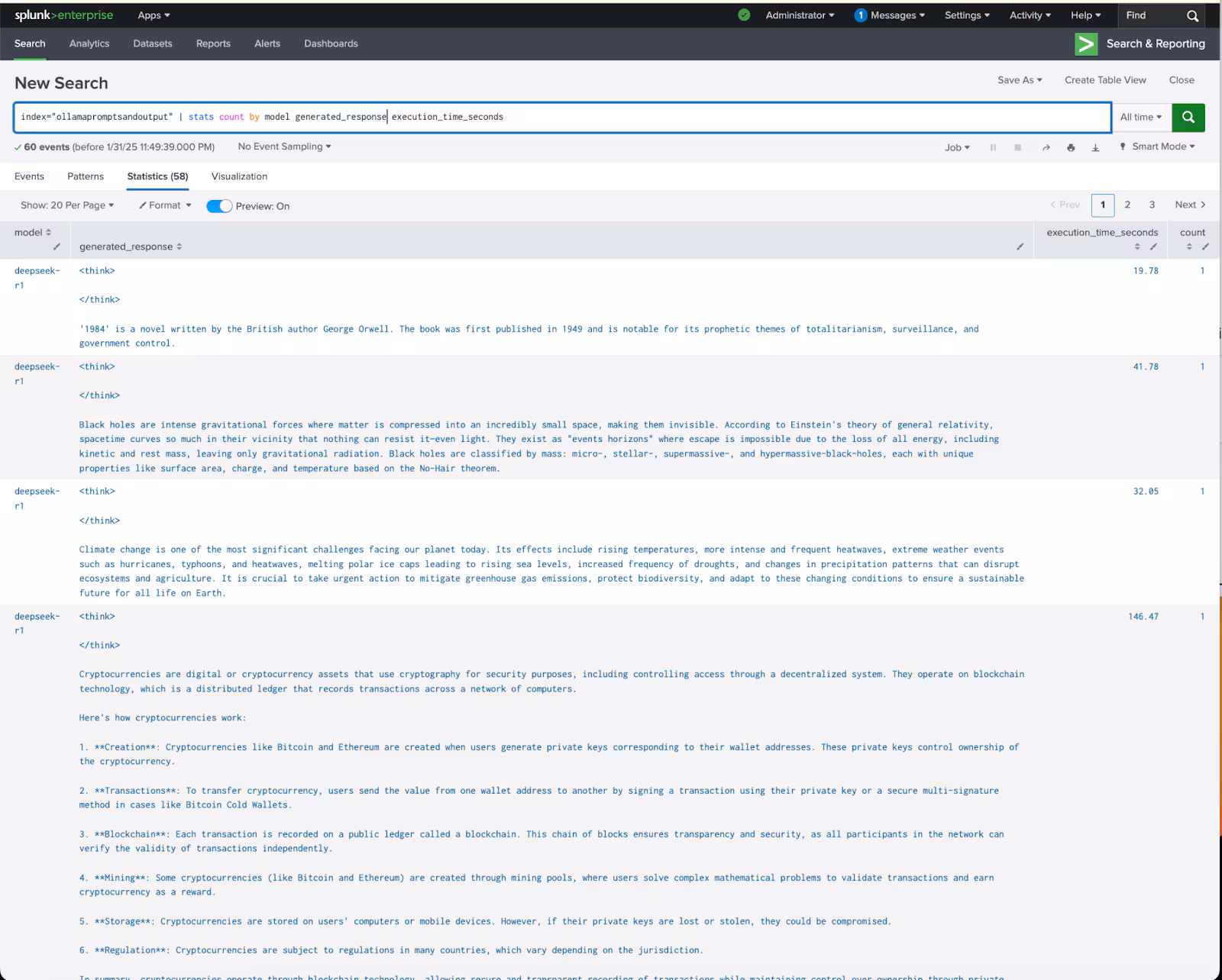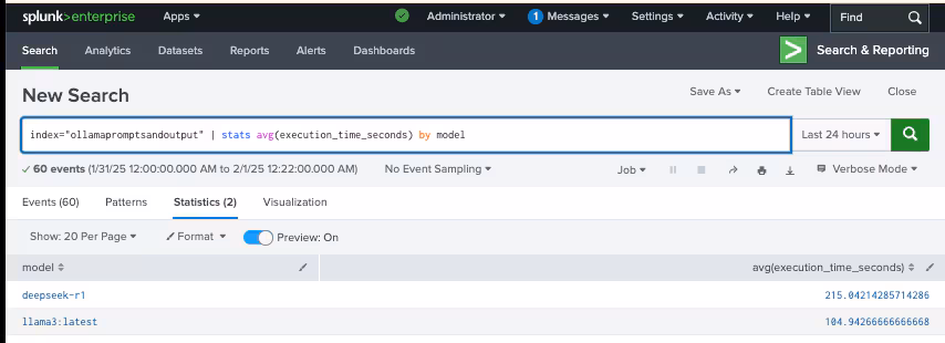 Let’slook at how these logs would look in Splunk. For this demo I created several scripts that interact with Ollama with the objective to obtain parseable logs that can give us useful information on System Messages, Prompts, API calls and Model performance into csv,json files so we can easily import them into Splunk. Dealing with Ollama logs is not easy and requires a bit of maneuvering. You can check my github to see the scripts I wrote for managing these logs.