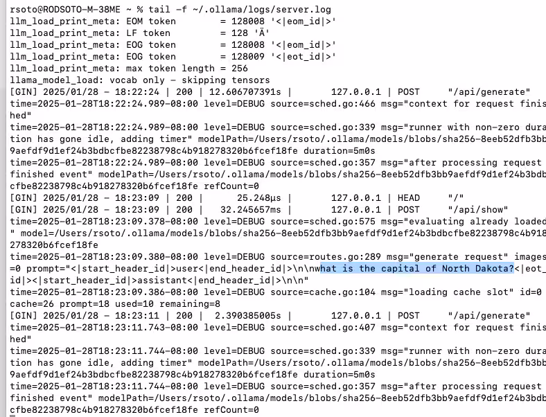 You can then tail -f ~/.ollama/server.log . As it can be seen in the screenshot below there is prompt information including the actual prompt.