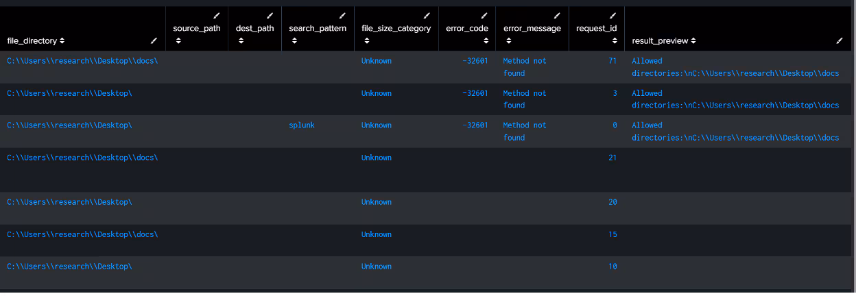| table timestamp_formatted, component, message_direction, operation_category, file_operation, operation_status, file_path, file_name, file_extension, file_directory, source_path, dest_path, search_pattern, file_size_category, error_code, error_message, request_id, result_preview