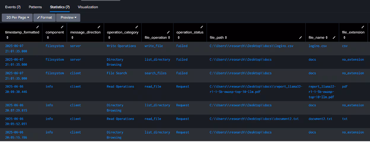 In this blog we are going to use a MCP Server based on this code found in my github . This code is used to create a file and Splunk MCP Server. We will then look at the logs produced during the usage of these MCP Servers and how we can approach monitoring of MCP Servers.
