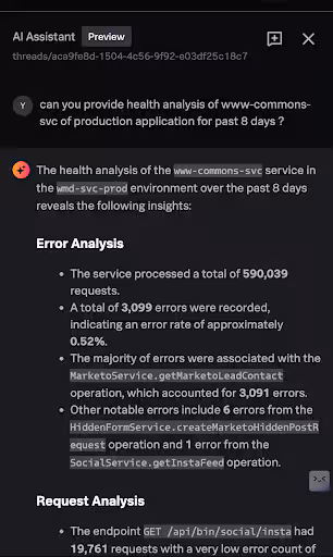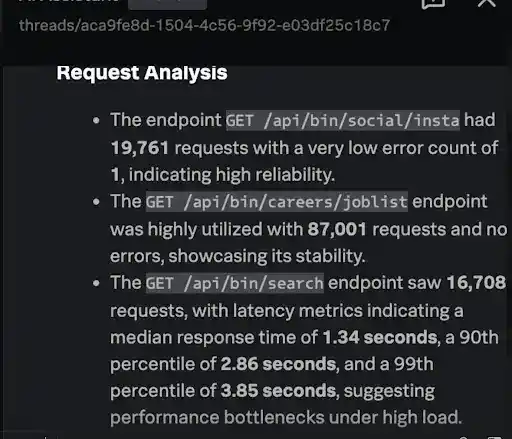 I asked APM AI to analyze Production common-service for the past 8 days. It highlighted The GET /api/bin/careers/joblist endpoint was highly utilized with 87,001 requests and no errors, showcasing its stability.