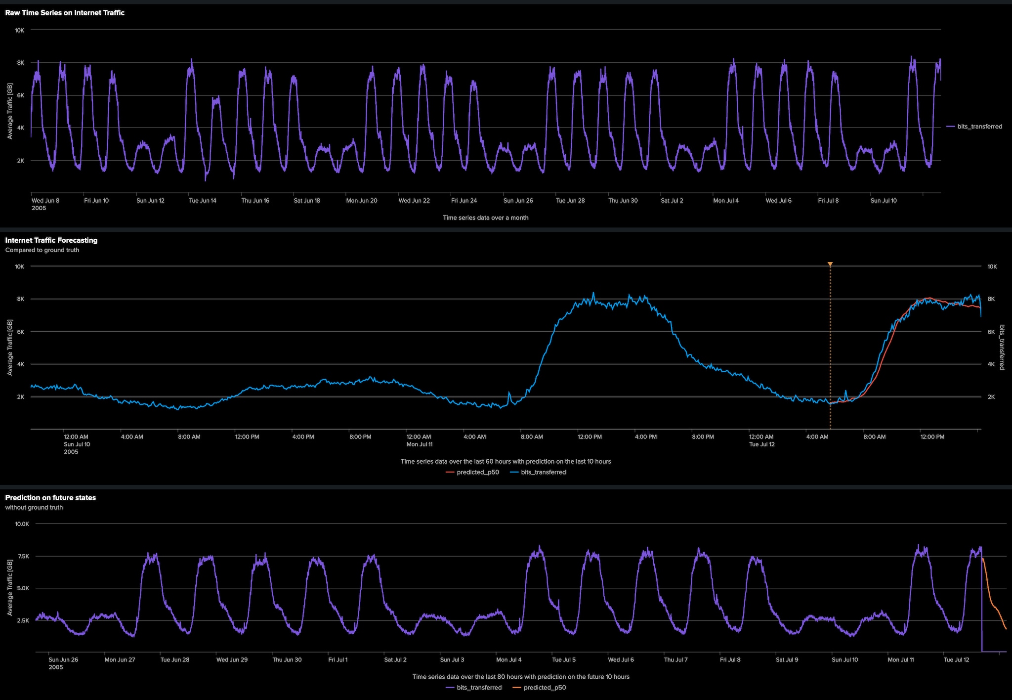 As shown in the charts, the orange line extending at the end of the series represents the model's future forecasting results. It adeptly captures the historical trends and projects them forward, providing a clear forecast for the next 10 hours. Such forecasts offer immense value across various domains, including enhanced IT monitoring, optimized resource planning, and even proactive security detections.